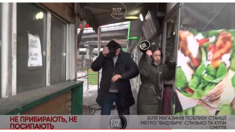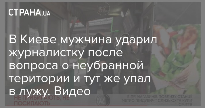В Киеве мужчина ударил журналистку после вопроса о неубранной територии и тут же упал в лужу. Видео